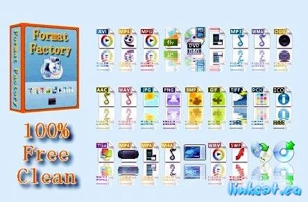 | Основные функции: * Видео вMP4/3GP/MPG/AVI/WMV/FLV/SWF * Аудио в MP3/WMA/AMR/OGG/AAC/WAV/FLAC * Фото в JPG/BMP/PNG/TIF/ICO/GIF/TGA * Перевод DVD в видео файлы , Копирование CD в аудио файлы. * MP4 файлы для форматов iPod/iPhone/PSP/BlackBerry * Поддержка исходных файлов RMVB Возможности Format Factory: * Конвертирование всех популярных форматов видео, аудио и изображений * Восстанавливает поврежденные видео и аудио файлы * Оптимизирует размеры мультимедийных файлов * Поддержка мультимедийных форматов iphone,ipod * Дополнительная обработка изображений Увеличение,Уменьшение,Поворот,Подпись * Копирование диска DVD в другие форматы * Поддержка 47 языков Язык: Русский / Multilanguage Размер: 21.58 mb